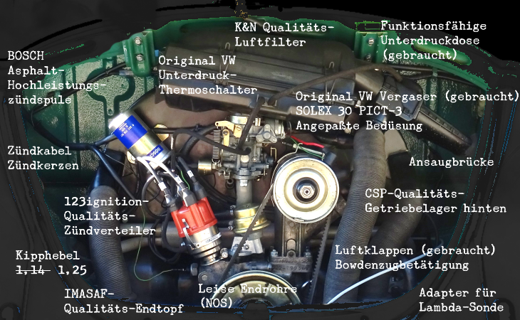 Nach einer Reihe von unkoordinierten Veränderungen habe in versucht, den Serienzustand wieder herzustellen, dem vor allem der BROSOL(-Ethanol)-Vergaser und etliche Nachbau-Teile schlechter Qualität im Weg standen. Vom Serienzustand ausgehend konnte ich nach einigen Optimierungen (siehe Bild) und vor allem unter Einsatz einer Lambdasonde einen geschmeidigen, durchzugskräftigen und geraduzu spritzigen Motorlauf erzielen. Ein herrliches Motörchen!